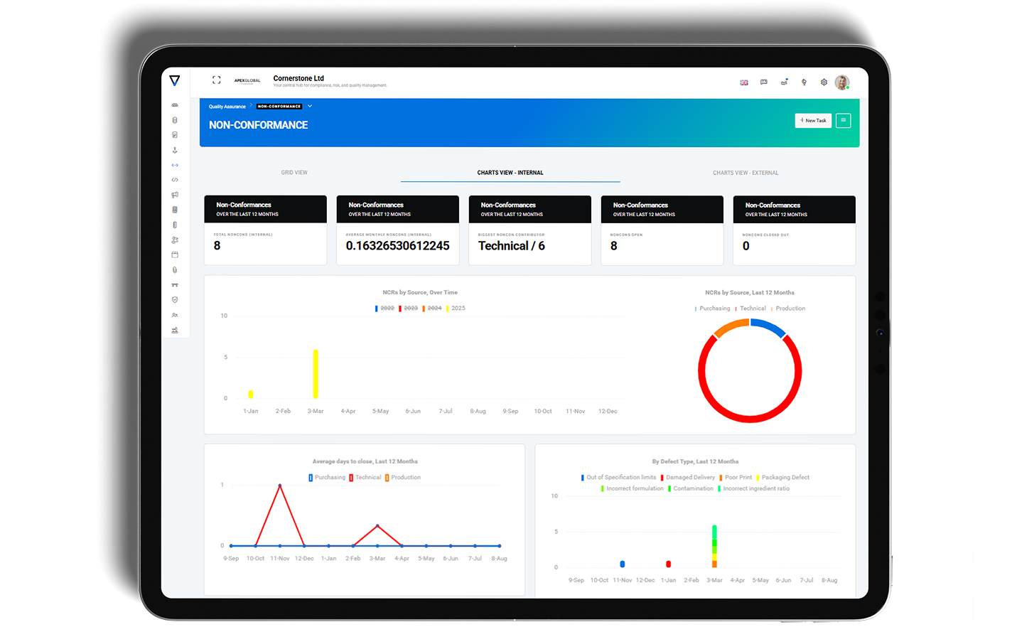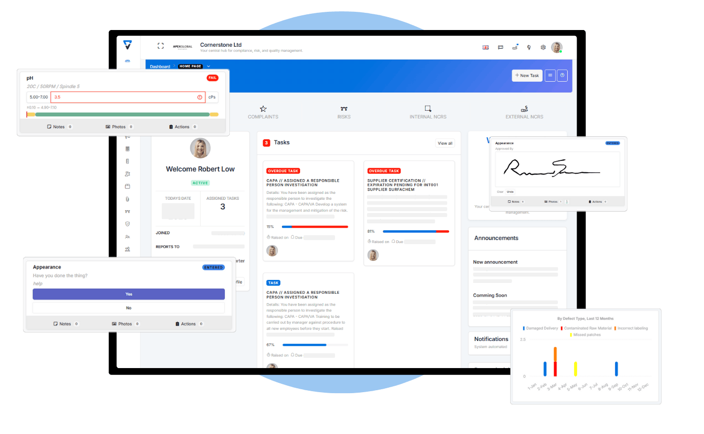 Tasks can be created through out cornerstones platform to personnel against any situation. Meetings, inspections, non-conformances, complaints and more. No messy emails that get forgetten about, but rather trackable, traceable tasks